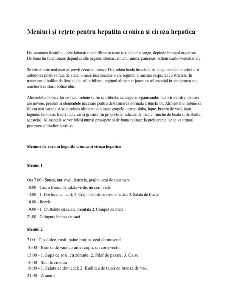 Chiar daca este o afectiune ireversibila, diagnosticarea la timp si tratarea cauzei sunt esentiale pentru evitarea daunelor suplimentare. Meniuri i reete pentru hepatita cronic i ciroza hepatic. Ciroza hepatica este o afectiune potential amenintatoare de viata, care apare atunci cand inflamatia tesutul fibrotic afecteaza ficatul.