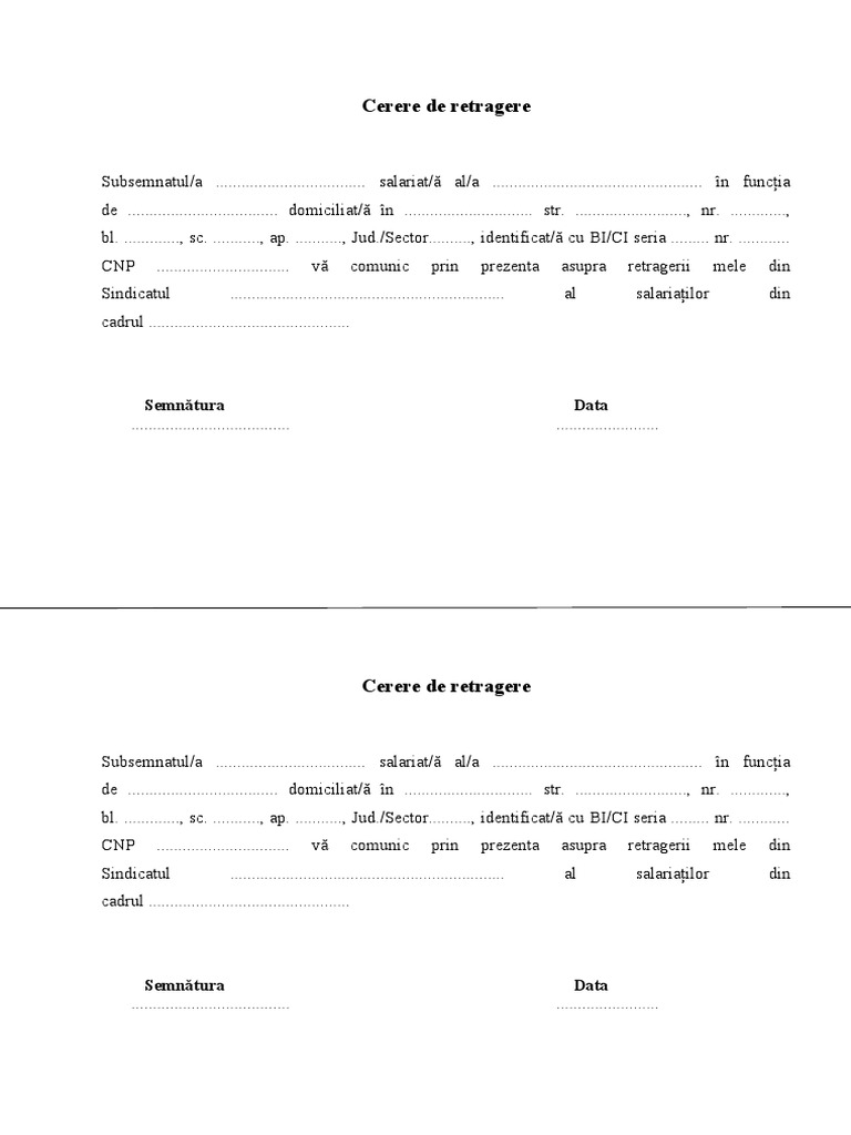 Model Cerere De Retragere Sindicat Source from : https://es.scribd.com/document/381873592/Model-Cerere-de-Retragere-Sindicat?referrer=utm_campaign%3Dapp_promo%26utm_source%3Dinterstitial%26utm_medium%3Dweb See more of arete syndicate on facebook. Bine ati venit pe forumul nostru. Junnnnkie la data de dum iul 22, 2012 9:01 am. Model cerere de retragere a apelului. Motiv (de *o cerere de absenta poate fii maxim de 2 luni* *cand ai revenit vei fii nevoit sa lasi un reply la cerere ca sa ne anunti* *după 15 zile de la cererea.