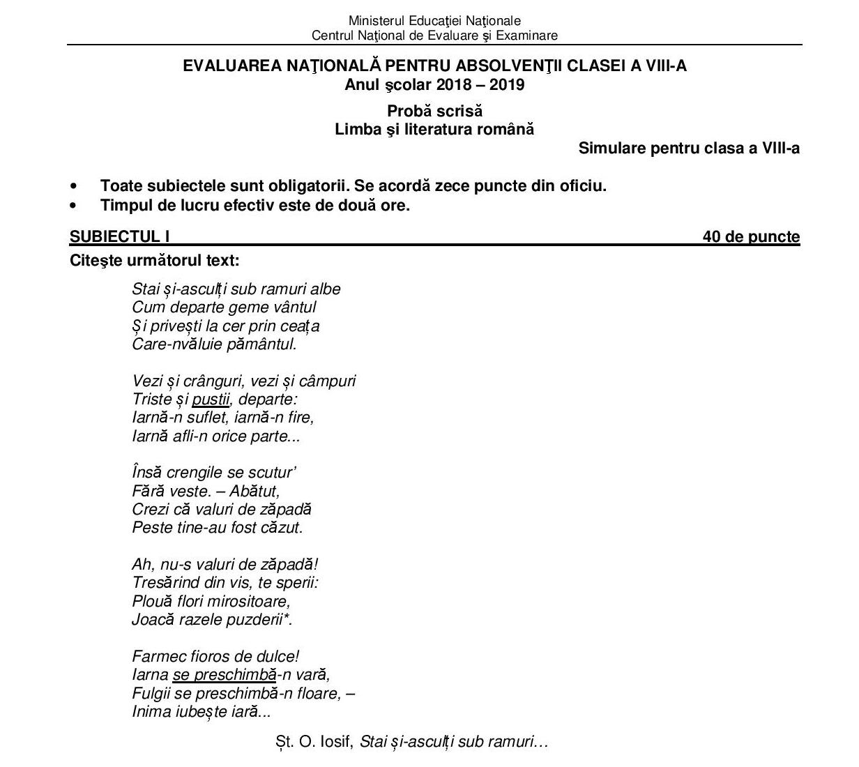 Simulare Clasa A 8 A 2019 Romana